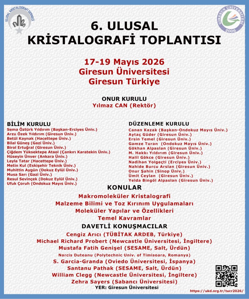 Ulusal Kristalografi Derneği’nin 6. sını düzenleyeceği “Ulusal Kristalografi Toplantısı” Giresun Üniversitesi’nde 17 – 19 Mayıs 2026 tarihlerinde gerçekleştirilecektir.