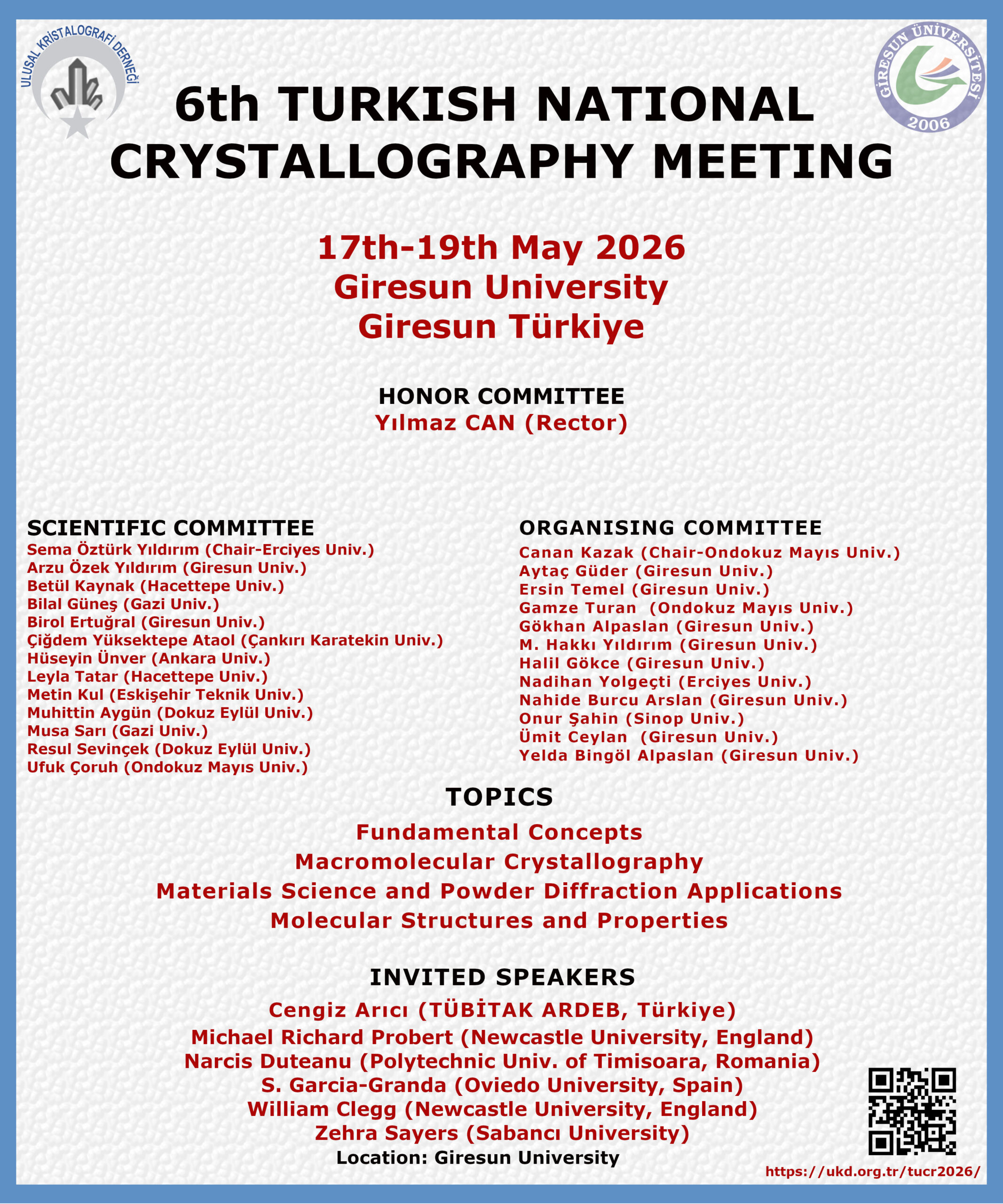 “The 6th Turkish National Crystallographic Meeting” of the National Crystallography Association will be held at Giresun University on 17 – 19 May 2026.